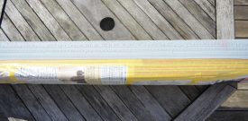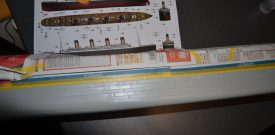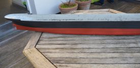 La coque est de deux couleurs.  Commençons par la couleur la plus clair.  Je met en premier un tape afin de préciser la ligne de flottaison.  Ensuit je cache le côté à peindre en noir.  Simplement avec du papier journal pour économiser le tape sur cette grande surface.